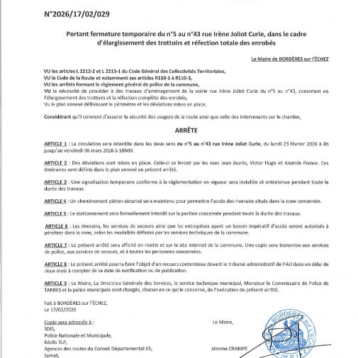 - La circulation et le stationnement seront interdits dans les deux sens des n°5 à 43 rue Irène Joliot Curie.