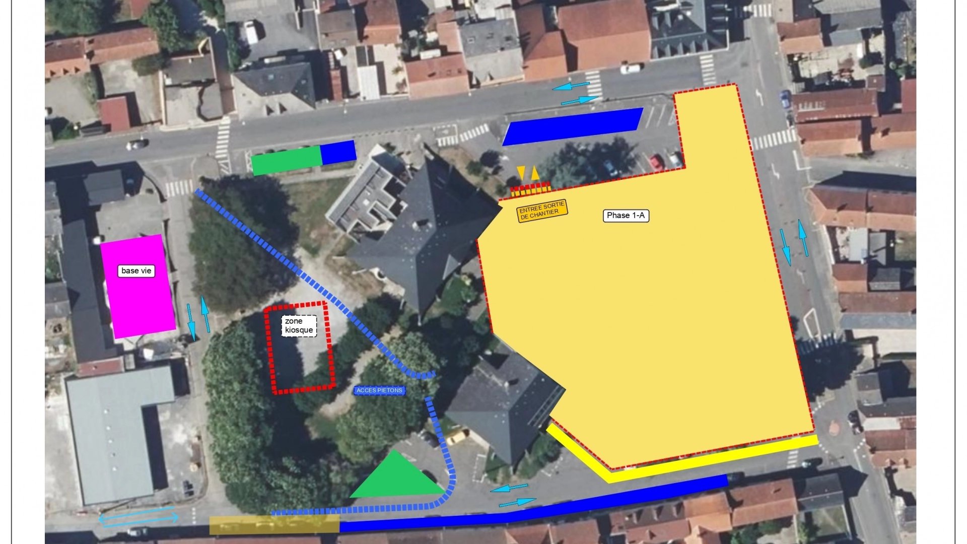Vous trouverez ci-dessous le plan de la place avec la zone de travaux de la phase 1 et les éléments concernant le stationnement, ainsi que l’arrêté municipal relatif à cette organisation.