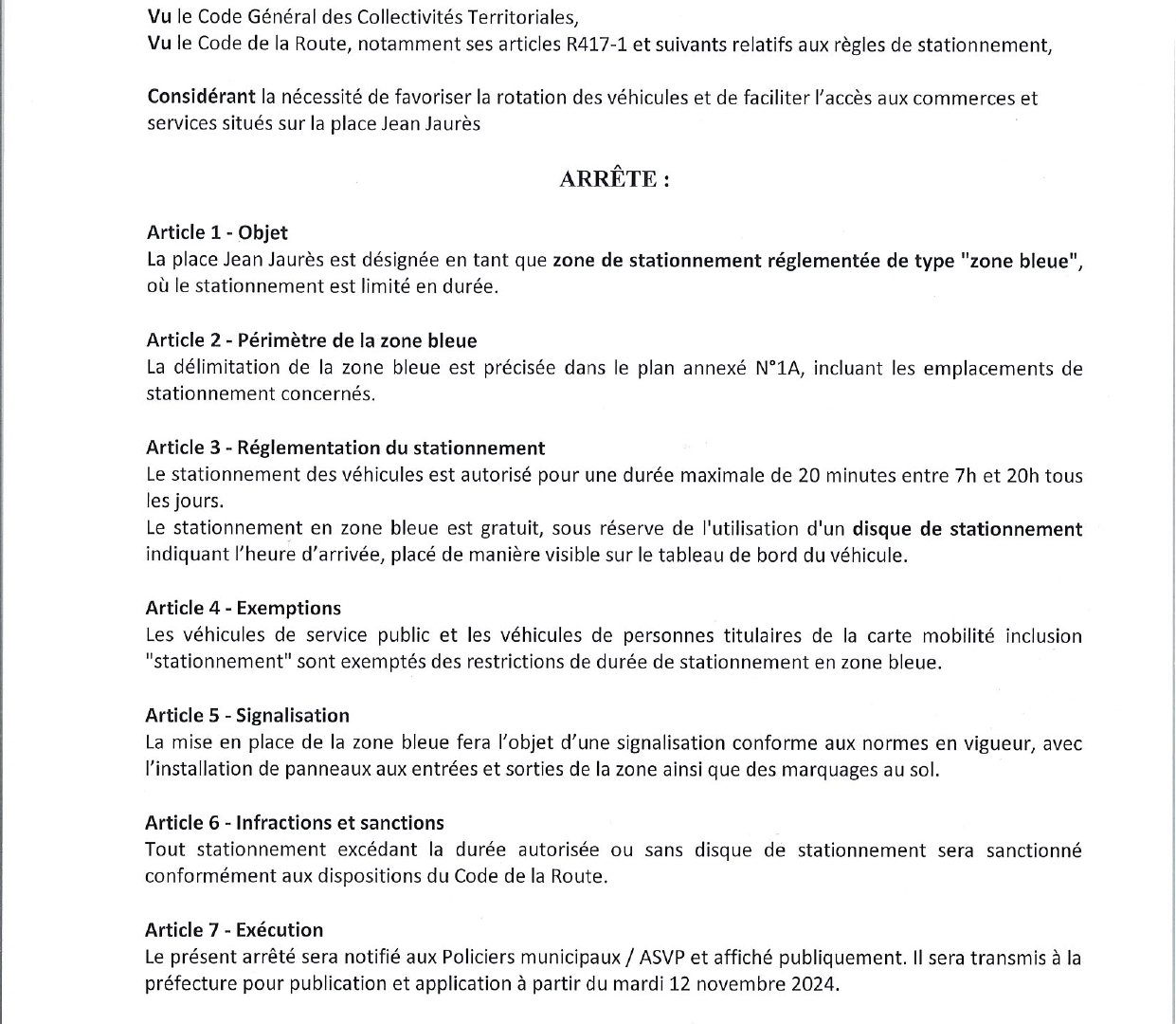 - mise en place de zones bleues. Le stationnement sera réglementé, limité à 20mn, de 7h à 20h, 7 jours/ 7,