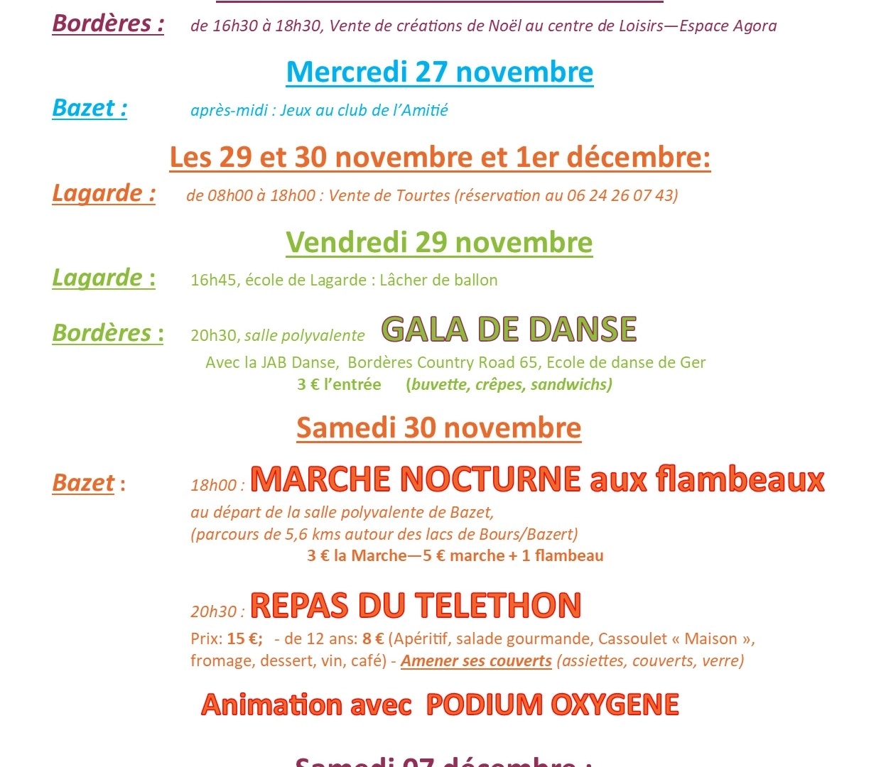 La coordination locale du Téléthon pour les communes de Bordères, Bazet, Oursbelille et Lagarde organise l'édition 2024 du 25 novembre au 6 décembre 2024.