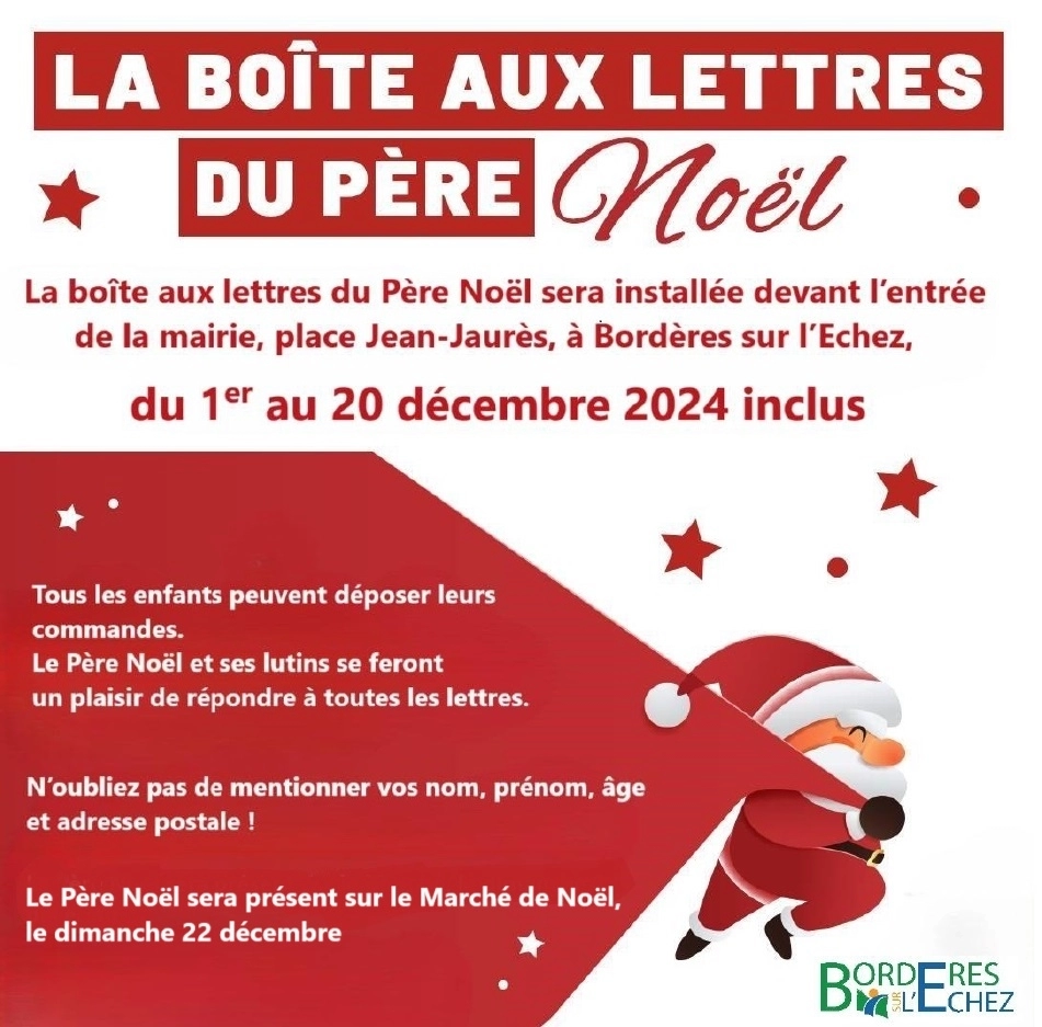 La boîte aux lettres du Père Noël sera installée devant l'entrée de la mairie, place Jean-Jaurès, du 1er au 20 décembre 2024 inclus.