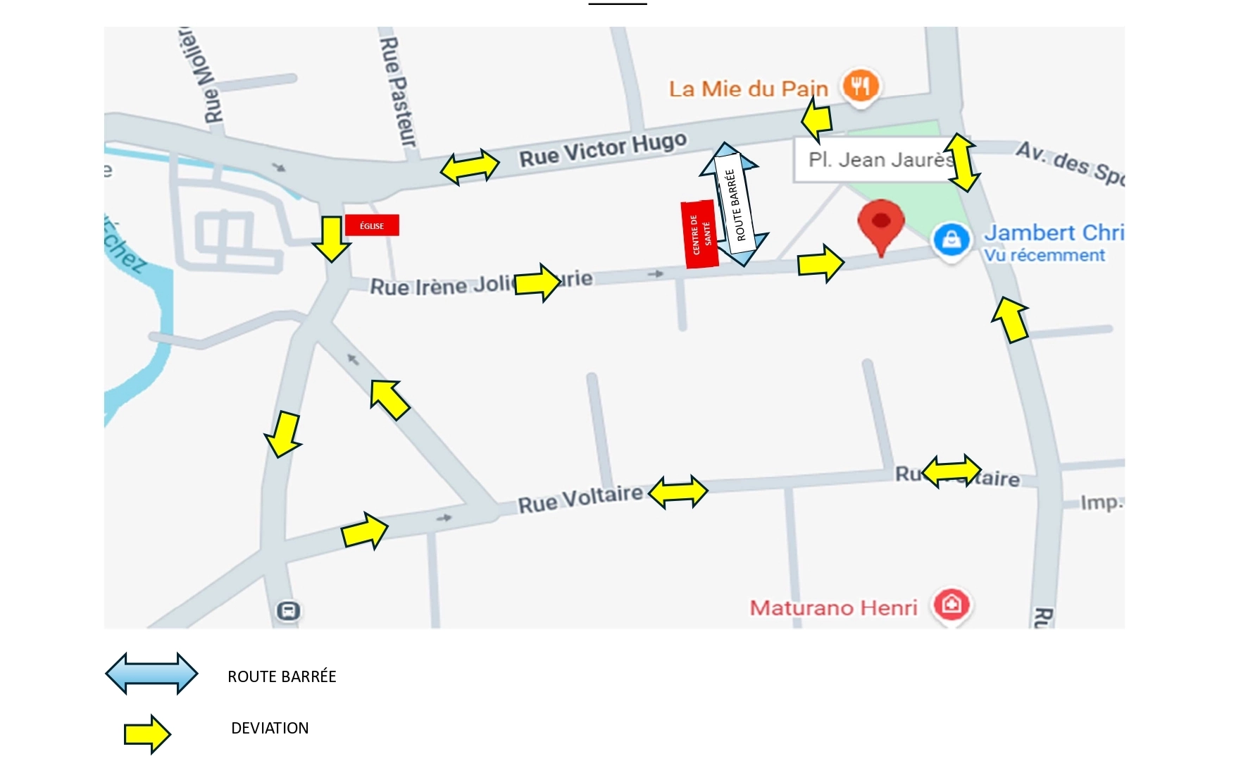 Des déviations seront mises en place pour permettre le contournement de la rue Jean Jaurès par les usagers. Ces itinéraires sont définis dans le plan ci-dessous.